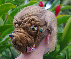 Thanks for stopping by to view my new pictures! Today I made up my hairstyle as I went along, with two side rope braids braided into an English braid. I made a small rosette with this English braid, then braided the remaining lower section of my hair into another English braid which I put in a low bun. I love my little hairclips that hold everything in place just right!