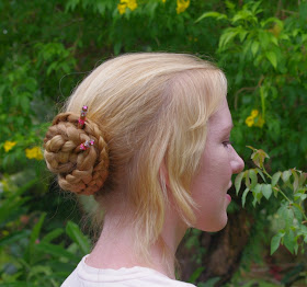 One of my sister's favorite go-to hairstyles is this pretty Oriental double knot bun with chop sticks. This hairstyle shows off her blonde streaks very nicely, too!